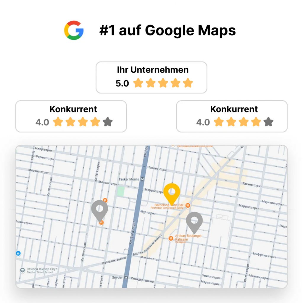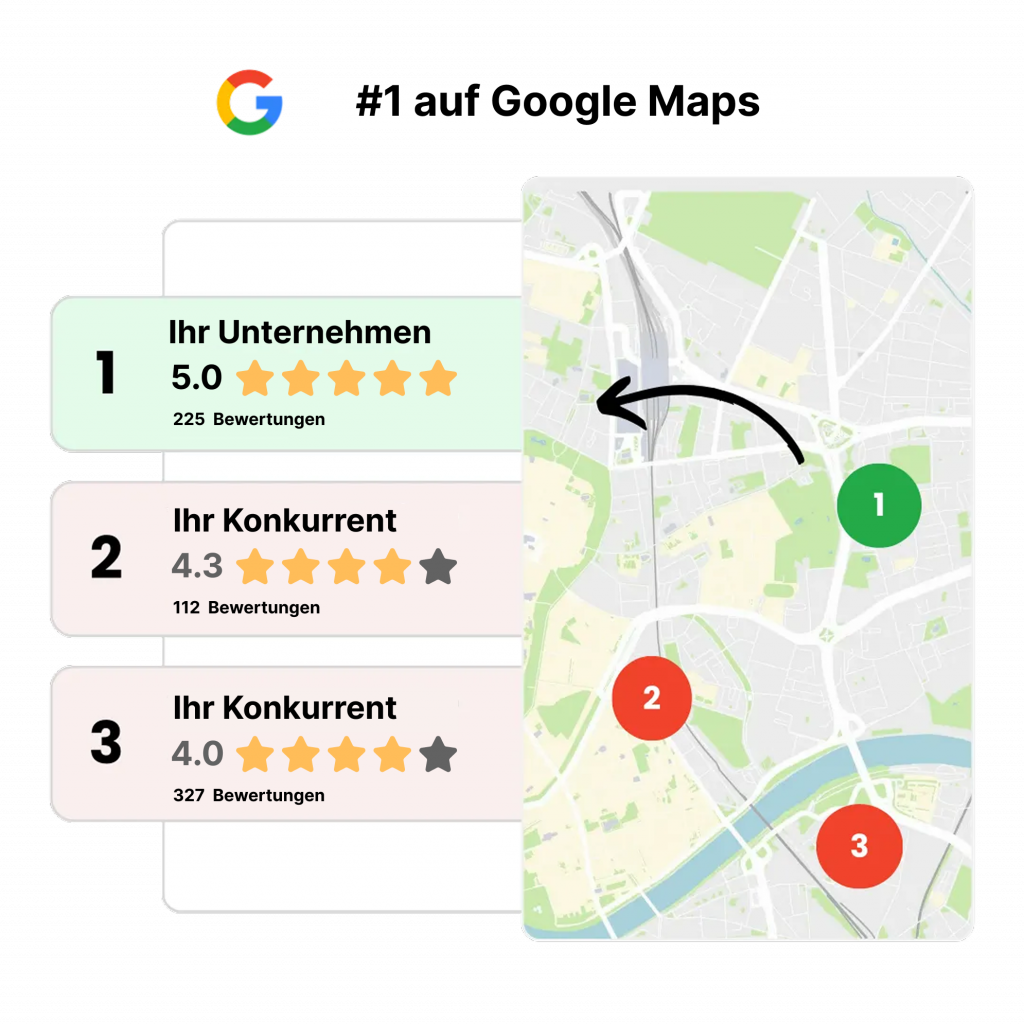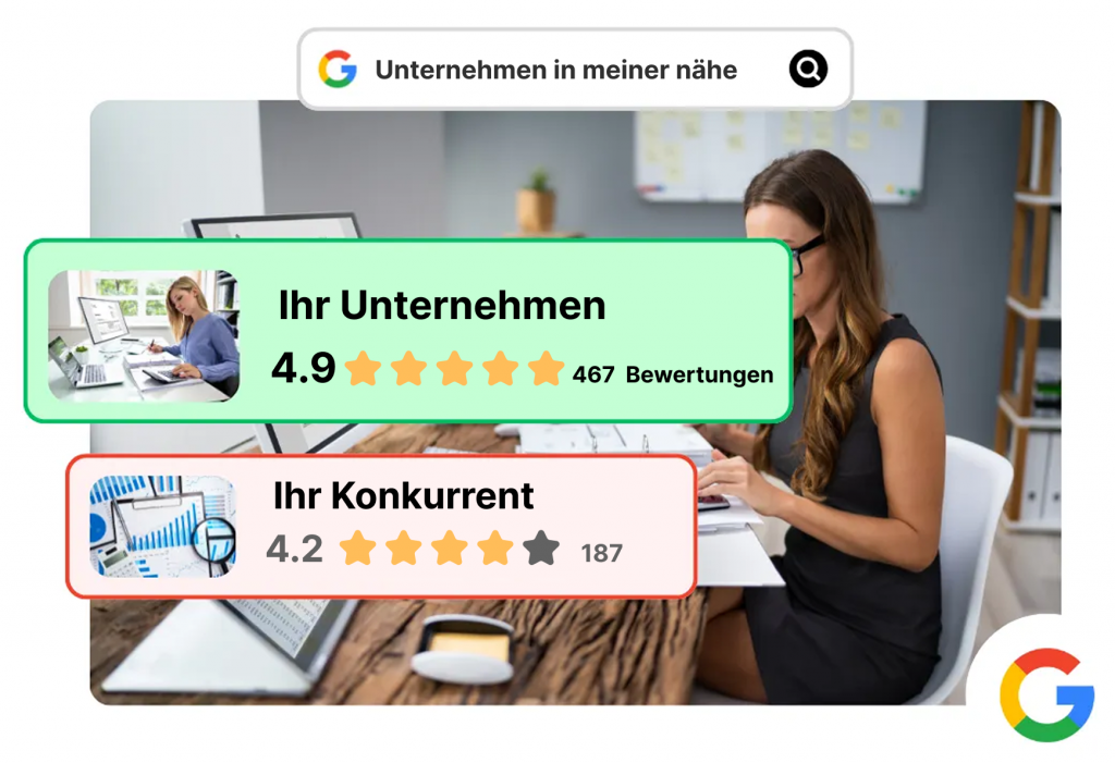 Google-Bewertungen verbessern Ihren Online-Ruf, erhöhen die Sichtbarkeit in den Suchergebnissen, schaffen Vertrauen bei potenziellen Kunden und tragen dazu bei, die Besucherzahlen und den Umsatz Ihres Unternehmens zu steigern.